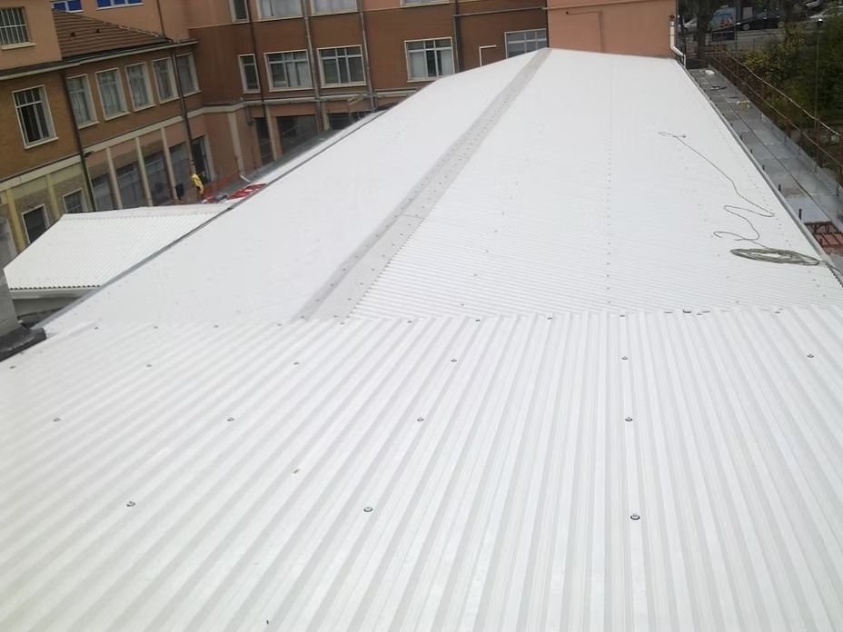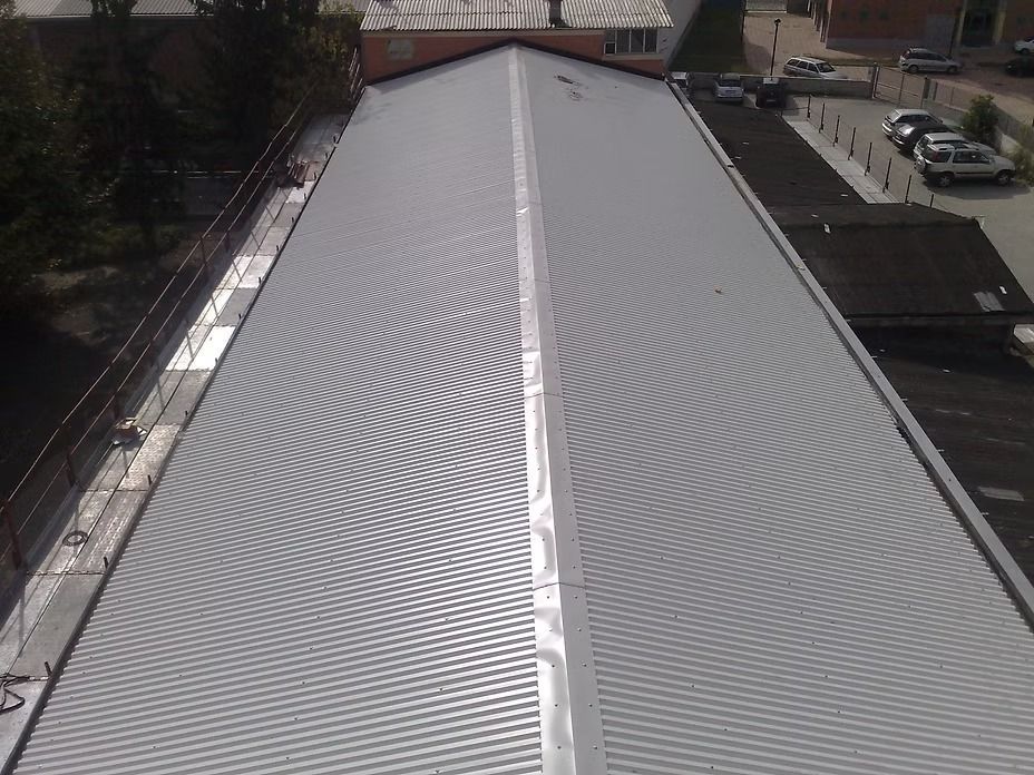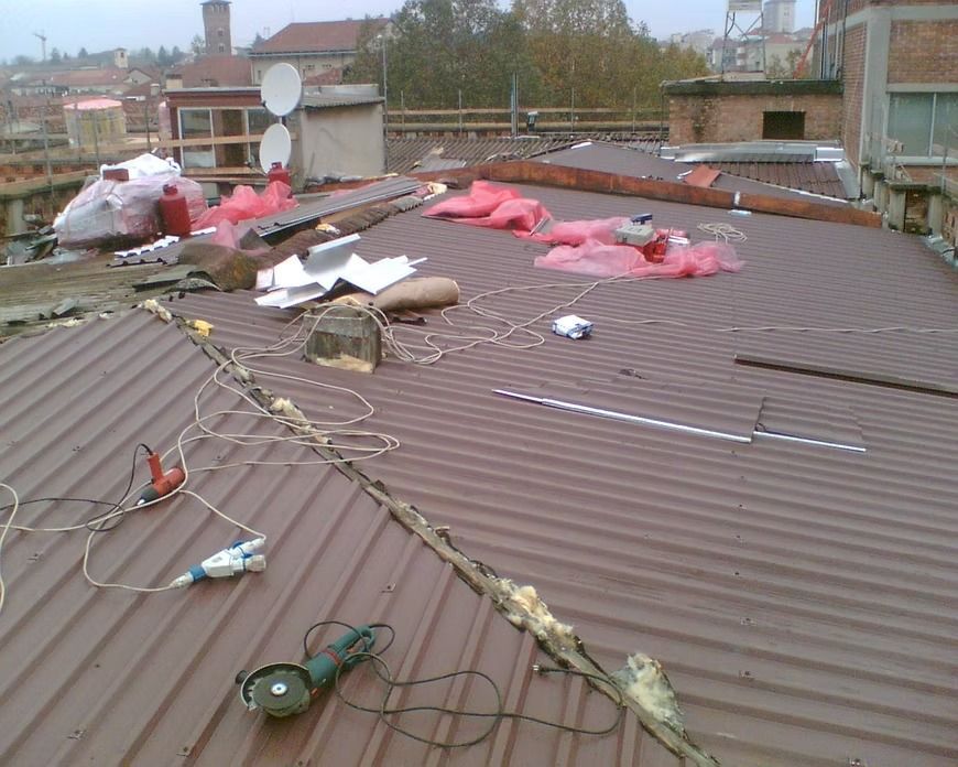 Bonifica completa di coperture in cemento-amianto con realizzazione di un nuovo pacchetto di copertura in lamiera coibentata, dotata di schiuma poliuretanica anti-rumore e anti-condensa.