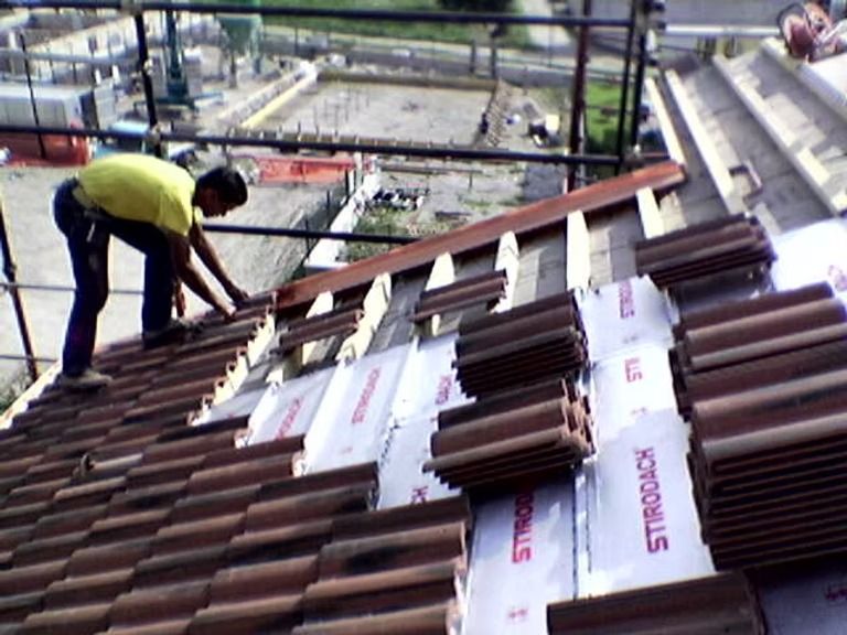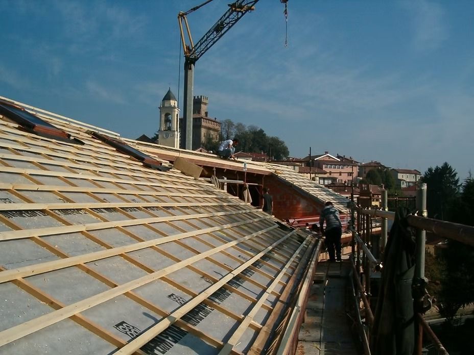 Rivestimenti tradizionali in laterizio, con il rifacimento delle strutture portanti in legno di abete e finitura in tegole di diversa tipologia e colore, per integrare al meglio la nuova copertura con lo stile dell’edificio.